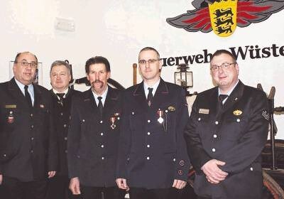 Bild: Bei den Ehrungen (von links): Kreisbrandmeister Uwe Vogel, Bürgermeister Heinz Nägele, die ausgezeichneten Karl Arnold (40 Jahre), Volker Bullinger (25 Jahre) und der Wüstenroter Kommandant Hans Mühlmann. (Foto: Petra Laidig)