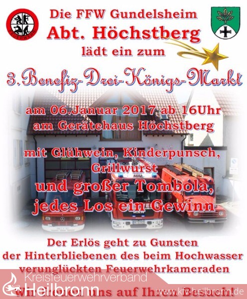 Für seine Frau und ihre drei Söhne wird es ein anderes Weihnachten sein. Um nach diesem schweren Schicksalsschlag die Familie zu unterstützen, werden wir, die Feuerwehr Gundelsheim Abt. Höchstberg, einen Benefiz Dreikönigsmarkt veranstalten. Gleichzeitig soll die Erinnerung an Benjamin allgegenwärtig sein und vor Augen führen wie gefährlich der Einsatzdienst ist.