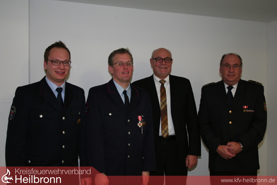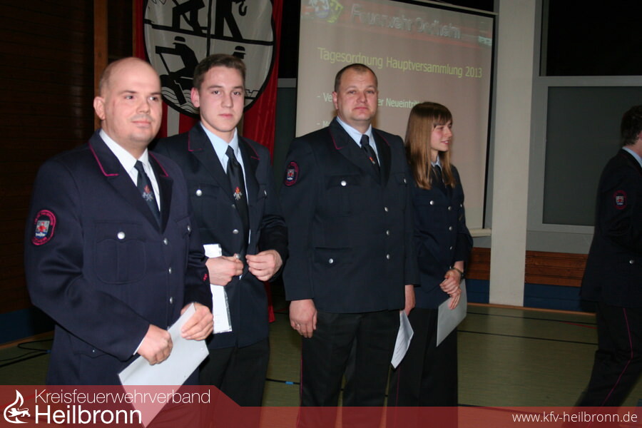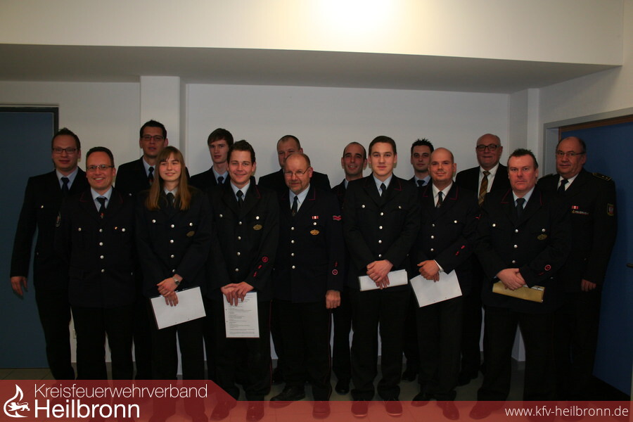 Kreisbrandmeister Uwe Vogel, Bürgermeister Ulrich Ruoff und Kommandant Sven Kübler zeichneten Rene Speckmaier mit dem Feuerwehr-Ehrenzeichen in Silber für 25 Jahre aktive Dienstzeit aus. Sieben Jugendliche der Jugendfeuerwehr erhielten die Jugendflamme I für ihre Ausbildung bei der Jugendfeuerwehr. Per Handschlag verpflichtete Sven Kübler die neuen Feuerwehrleute Markus Geuting, Sascha Kuhn, Florian Mann, Wladyslaw Piedziak, Yannick Pilz und Melanie Seel für den Feuerwehrdienst. Erfreulicherweise konnte er Thomas Feeser, Julian Knecht und Sascha Rauhut zum Feuerwehrmann und Nicole Möbus zum Hauptfeuerwehrmann befördern. Stefan Deckert und Marcel Glaser konnten nach ihrem bestandenen Zugführerlehrgang zum Brandmeister ernannt werden. Bürgermeister Ruoff überreichte Kommandant Sven Kübler, dem Stv. Kommandanten Markus Knoll und Abteilungskommandant Daniel Enderer die Ernennung zum Oberbrandmeister. Nach den einschneidenden und zukunftsweisenden Wahlen im Vorjahr standen in diesem Jahr nur zwei Wahlen an. Stephan Höpfer wurde ebenso einstimmig in seinem Amt als Stv. Zugführer II. Zug und Ausschussmitglied bestätigt wie die beiden Kassenprüfer Peter Kartes und Gerd Klaiber. Mit dem Dank des Ehrenkommandanten Franz Schuster an Kommandant Sven Kübler für dessen ereignisreiches erstes Jahr endete eine harmonisch verlaufene Hauptversammlung.