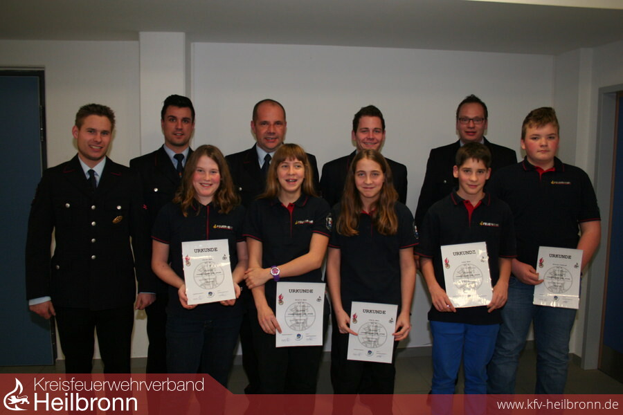 Bild 2: Bei der Hauptversammlung der Freiw. Feuerwehr Oedheim überreichten Kommandant Sven Kübler (re. hinten), Jugendwart Peter Mall und die Betreuer Marcel Ester, Manuel Baumgart und Yannick Pilz (hinten) den erfolgreichen Jugendlichen der Jugendfeuerwehr die Urkunde für die Jugendflamme.