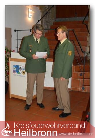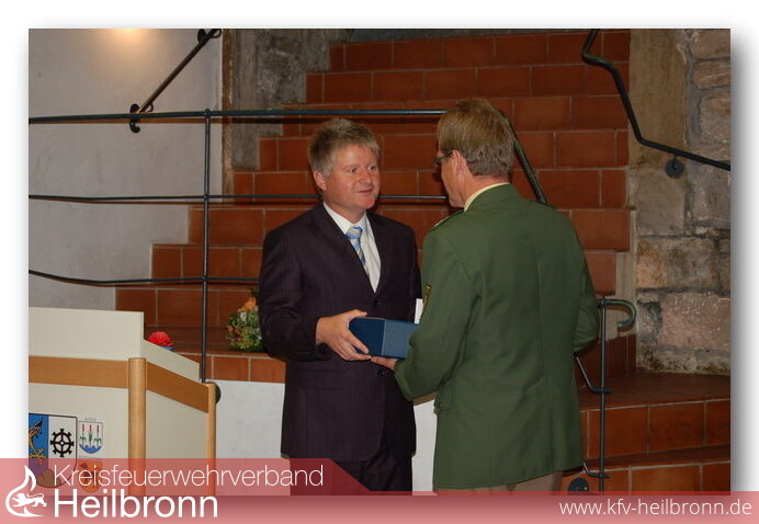 Auch die Feuerwehr Möckmühl, war wegen des guten Verhältnisses zum Polizeiposten und der vorbildlichen Zusammenarbeit eingeladen. Kommandant Uwe Thoma bedankte sich bei Bernhard Kohlhammer für die sehr gute und jahrzehntelange Zusammenarbeit zwischen dem Polizeiposten und der Feuerwehr. Er gratulierte dem Pensionär zum erreichen des Ruhstandes, wünschte ihm Glück und vor allen Dingen viel Gesundheit. Als äußeres Zeichen der Verbundenheit und zur Erinnerung an die zurückliegende, vorbildliche Zeit der Zusammenarbeit, überreichte er einen gravierten Zinnteller.