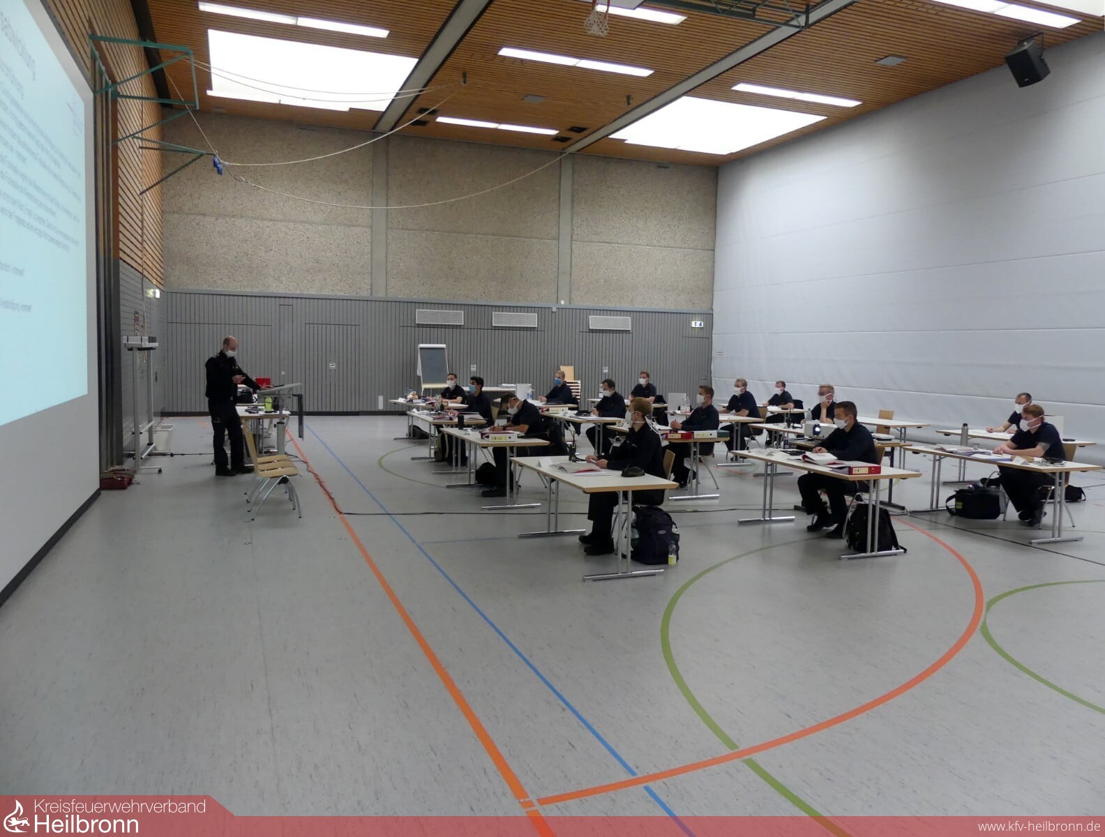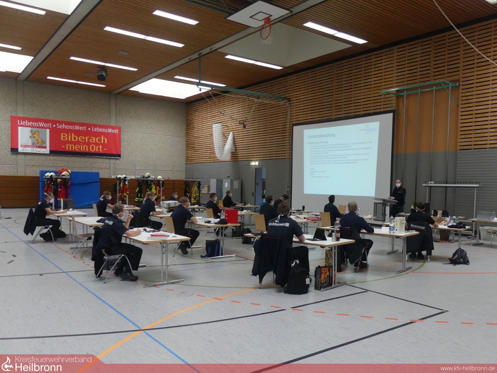Glücklicherweise konnte schnell eine perfekte Lösung in der zurzeit ungenutzten Böllingertalhalle im Stadtteil Biberach gefunden werden. Mit etwas Aufwand zum Megaunterrichtsraum umfunktioniert, eignete sich die Mehrzweckhalle aufgrund ihrer Dimensionen perfekt zur Einhaltung aller Corona-Sicherheitsvorgaben. Vorbildliche Unterstützung auf ganzer Linie erhielt die Feuerwehr von Beginn an durch den zuständigen Hausmeister, der immer ein offenes Ohr für die Belange des Lehrganges hatte.
