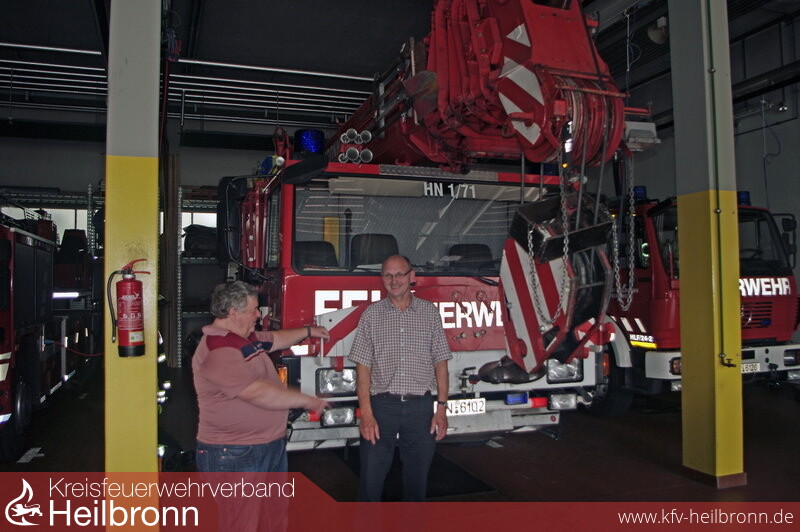 Bild 6: Feuerwache Heilbronn. Helmut Gogel mit dem Kommandant der Feuerwehrabteilung Pöndorf-Schwaigern, Franz Weiser, vor dem Feuerwehrkran