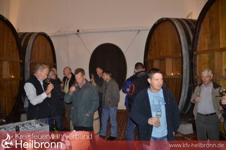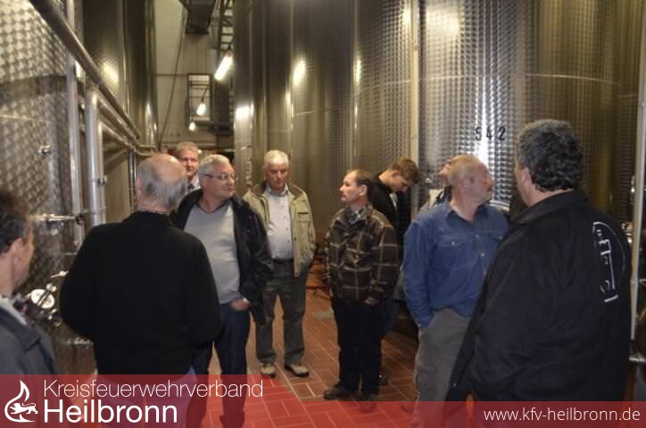 Bei den Heuchelberg Weingärtner warteten die Feuerwehrangehörigen Jörg Zundel und Jürgen Koch bereits, um die Gäste in zwei Gruppen durch den Betrieb zu führen. Von der Traubenannahme bis zur Abfüllung bekamen die Gäste alle Stationen der Weinbereitung zu sehen. Im Fassweinkeller wurden zwei Spezialitäten des Betriebs verkostet.