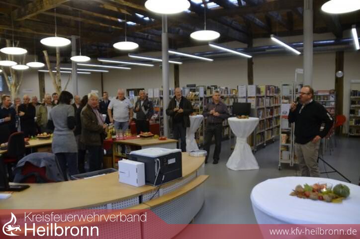Bild 1: Empfang in der Mediathek. Kommanandt Jügen Kachel heißt die Gäste willkommen.