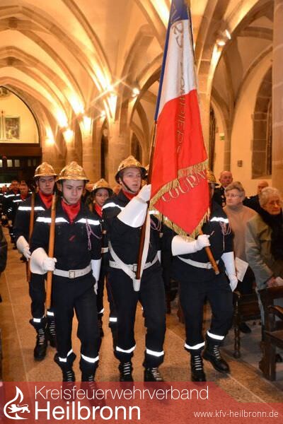 Anlässlich der Feierlichkeiten zum Sankt Barbara-Tag folgte eine Delegation der Feuerwehr Bad Rappenau letztes Wochenende einer Einladung der Feuerwehrkameraden unserer Partnerstadt Contrexeville. Hintergrund des jährlichen Festaktes ist der Tag der Schutzpatronin der französischen Feuerwehr, der „Heiligen Barbara“, ähnlich, wie es bei uns der „St. Florian“ darstellt. Der Ablauf der Zeremonie gestaltet sich nach strengen Regeln, da in Frankreich die Feuerwehr dem Verteidigungsministerium unterstellt ist. Begonnen wird mit einer Aufstellung auf dem Paradeplatz, bei welchen den im Dienst verstorbenen Feuerwehrkameraden, mit namentlicher Nennung, gedacht wird. Anschließend werden Beförderung und Ehrungen der Feuerwehrangehörigen öffentlich durchgeführt. Dabei sind hier der Landrat, der Kreisbrandmeister sowie die Bürgermeister der Städte Contrexeville und Vittel vertreten. Das Ganze wird begleitet durch den Musikzug der Feuerwehr mit der Nationalhymne und weiteren Musikstücken. Danach erfolgt ein Marsch durch die Stadt zur Kirche, in welcher speziell für die Feuerwehr ein Gottesdienst abgehalten wird. Sehr beeindrucken sind hier die eleganten Uniformen der französischen Wehr mit den goldfarbenen Hochglanz – Feuerwehrhelmen. Dabei sind hier natürlich die Jugendfeuerwehr sowie die Altersmannschaft und Ehrenkommandanten.