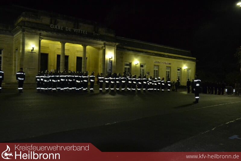 Nach dem Kirchgang und dem Segen für alle Feuerwehrmitglieder wird erneut Aufstellung genommen und die Parade geht, gefolgt von zahlreichen Feuerwehrfahrzeugen, im Gleichschritt durch die Stadt zum Rathaus, wo ein Empfang der Teilnehmer erfolgt. Hier werden noch von den Bürgermeistern und Ehrengästen Grußworte an die Teilnehmer gerichtet. Nach Abschluss der Zeremonie, welche bis zu drei Stunden dauert, wird dann endlich gefeiert. Und bekanntermaßen können das die Franzosen. In der Stadthalle wird ein Menu für alle Feuerwehrangehörigen und deren Partner ausgerichtet. Bei dem Abendessen werden Rückblicke auf ernste und lustige Momente des vergangenen Dienstjahres gehalten. Zum Schluss kommt wieder Schwung in die Teilnehmer, denn wer viel essen darf, muss sich an schließend wieder bewegen: es wird getanzt bis in den Morgen, denn auch dort zählt Sport zur Erhaltung der Einsatzfähigkeit und Fitness zur obersten Priorität. Die Delegation der Feuerwehr Bad Rappenau bestand aus den Kameraden Stefan Wegner, Andreas Haffelder, Marcel Rösch, Martin Gabel (Abt. Obergimpern) und Harald Scholz (Abt. Wollenberg). Im Gegenzug werden uns die Kameraden aus Contrexeville wieder im Juni zum Stadtfest zur Pflege der städtepartnerschaftlichen Kontakte besuchen