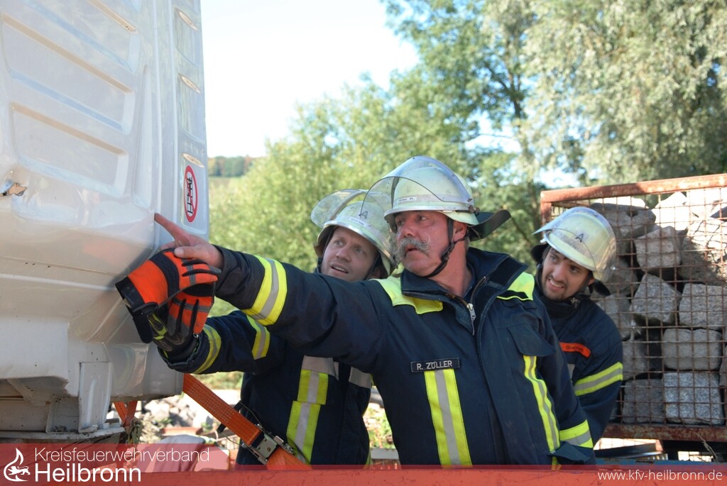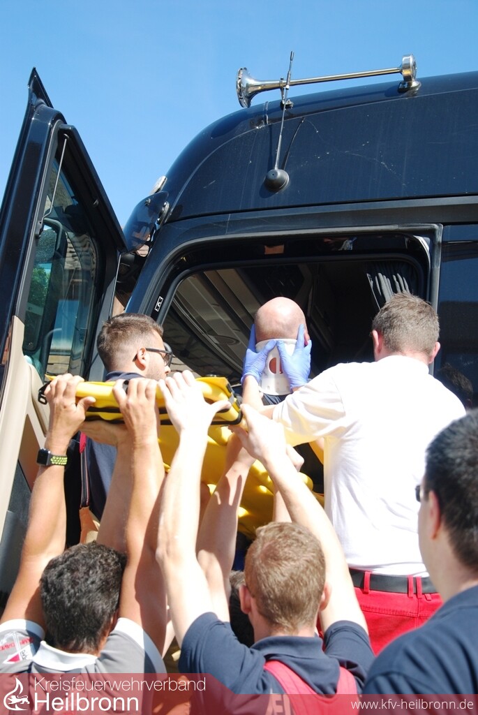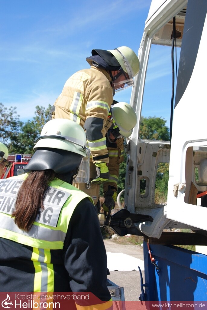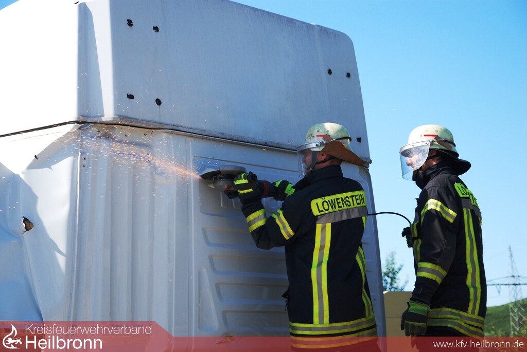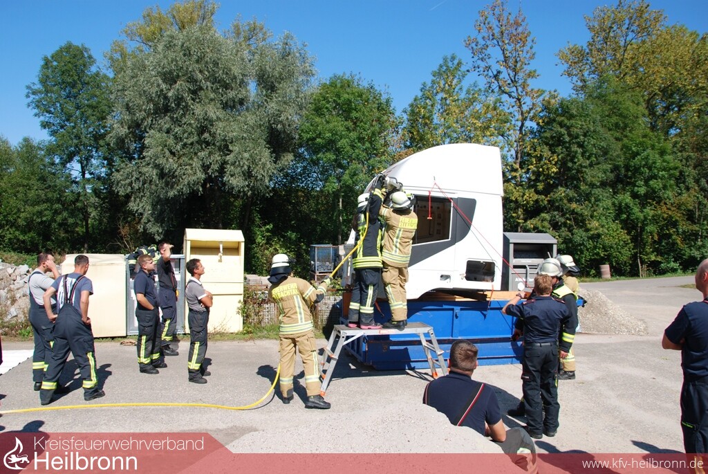 Mit Unterstützung der Firmen Barthau Containerbau und Assenheimer Mulfinger, konnten die Einsatzkräfte danach aktuelle Lastkraftwagenmodelle ausführlich kennenlernen und erste Rettungsübungen durchführen. Am Nachmittag folgte die große Einsatzübung auf dem Übungsgelände der Freiwilligen Feuerwehr Weinsberg. An einer Fahrerkabine im Rohbauzustand konnten die Teilnehmer die Einsatzmöglichkeiten der technischen Hilfsmittel und die unterschiedlichen Vorgehensweisen testen und vergleichen.