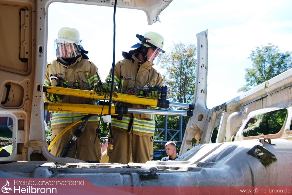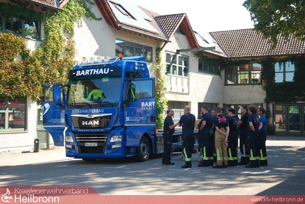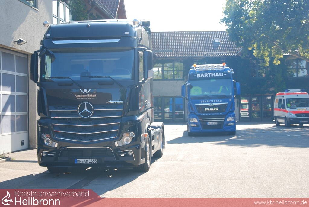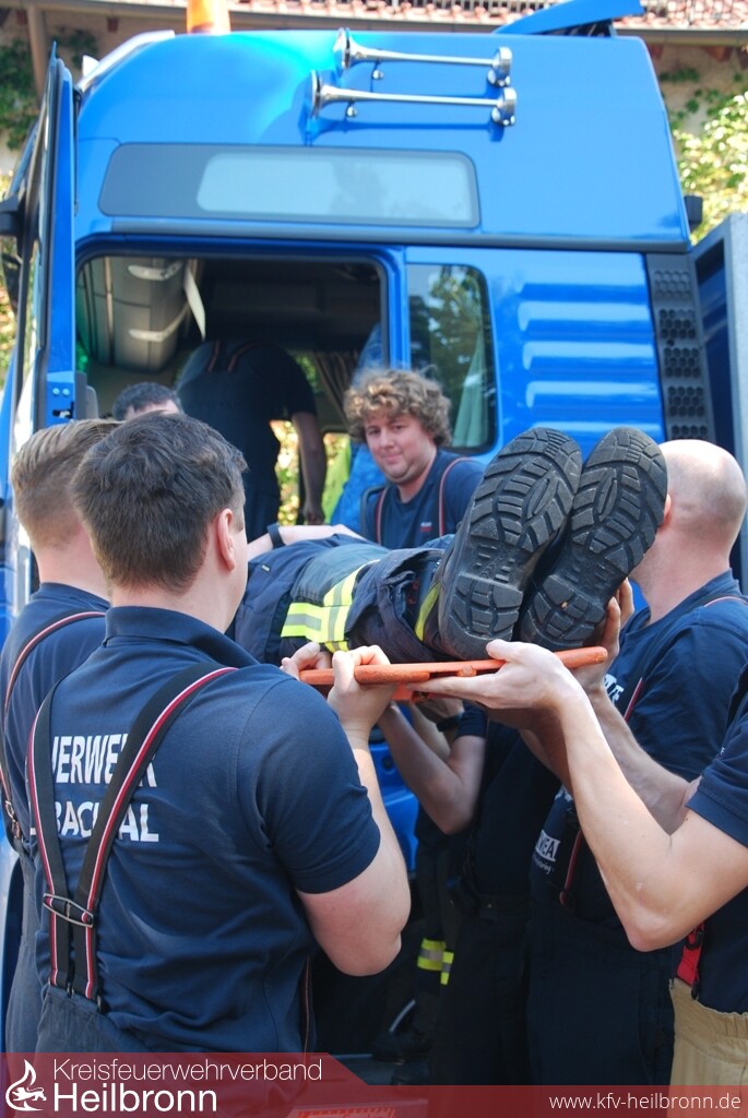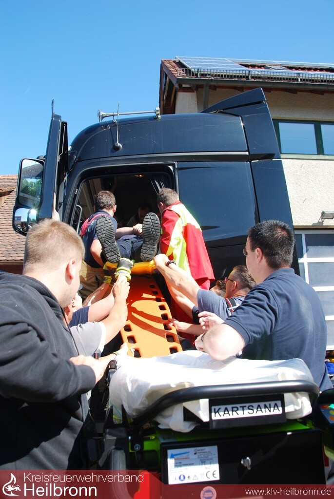 Mit Unterstützung der Firmen Barthau Containerbau und Assenheimer Mulfinger, konnten die Einsatzkräfte danach aktuelle Lastkraftwagenmodelle ausführlich kennenlernen und erste Rettungsübungen durchführen. Am Nachmittag folgte die große Einsatzübung auf dem Übungsgelände der Freiwilligen Feuerwehr Weinsberg. An einer Fahrerkabine im Rohbauzustand konnten die Teilnehmer die Einsatzmöglichkeiten der technischen Hilfsmittel und die unterschiedlichen Vorgehensweisen testen und vergleichen.