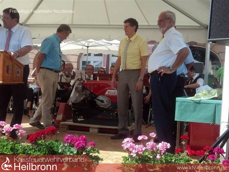 Gemeinsam mit vielen Bürgerinnen und Bürgern aus dem Stadtteil Herbolzheim war eine Delegation der Neudenauer Feuerwehr am dritten Juliwochenende nach Herbolzheim im Breisgau unterwegs. Grund des Besuchs war das Jubiläum „425 Jahre Marktrechte der Stadt Herbolzheim“. Das Wochenende stand ganz im Zeichen dieses Jubiläums und wurde in der Innenstadt groß gefeiert. Beim offiziellen Festakt am Samstagnachmittag hatte dann die Feuerwehr Neudenau auch noch Grund zum Feiern. Die Badischen Versicherungen / BGV überreichten Herrn Bürgermeister Hebeiß, Ortsvorsteher Reinhart und Kommandant Wagner eine Tragkraftspritze des Typs „Fox“ der Firma Rosenbauer. Mit dieser großzügigen Spende im Wert von über 10.000 Euro wird die Leistungsfähigkeit der Feuerwehr noch mehr gesteigert.