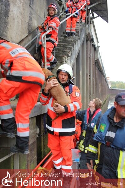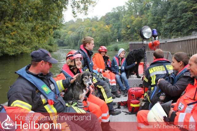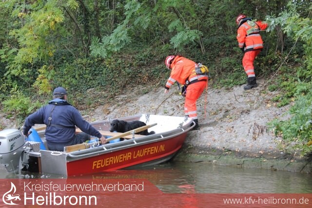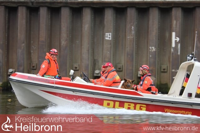 Mit dem Mehrzweckboot und Rettungsboot der Feuerwehr Lauffen wurden die Hundeführer/-innen mit ihren Suchunden am Neckar an der Slipanlage auf dem Kiesplatz aufgenommen, um diese dann im Zementwerkhafen an der rund 7 Meter hohen Spundwand, bzw. auf der dort gegenüberliegenden Zementwerkinsel für eine Personen- und Trümmersuche abzusetzen.