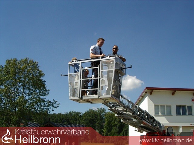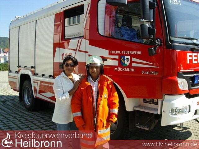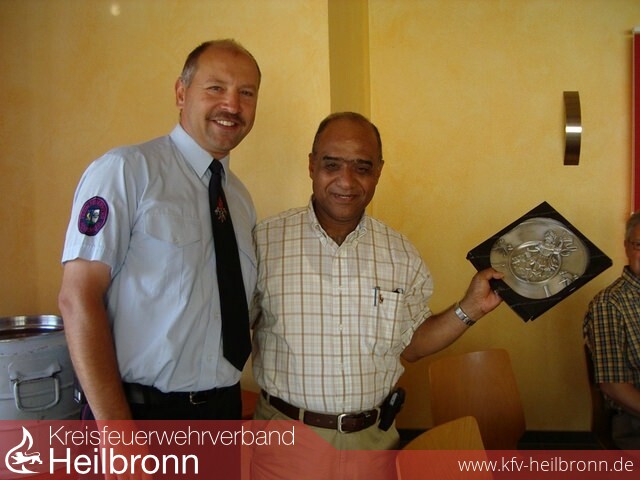 Bereits vor vielen Jahren lernte der der kuwaitische Botschafter Faisal R. Al-Ghais in einem Sommerurlaub die aus Möckmühl stammende Familie Schmidt kennen. Seit Jahren nun verbindet sie eine enge Freundschaft, weshalb der hohe Gast ab und an seinen Jahresurlaub in Möckmühl verbringt. Und wie könnte es für einen Diplomaten anders sein, so informiert er sich auch in seinem Urlaub über Land und Leute besonders über die kommunalen Einrichtungen. Auf seinem diesjährigen Programm stand der Besuch der Feuerwehr Möckmühl. Diesen Punkt setzte der Botschafter, der jetzt nach Stationen in Bonn, Berlin, Wien und Brasilien, seinen Dienst für sein Land in Peking erbringt, ganz oben auf seine Wunschliste. Er zeigte sich sehr überrascht über die Ausstattung, die Fahrzeuge und die vielen Einsätze, welche jedes Jahr bewältigt werden müssen. Noch überraschter war er darüber, dass all diese Leistungen im Ehrenamt erbracht werden. Auch bei seiner Ansprache bemerkte er, dass so etwas nur in Deutschland bei der dort vorhandenen Mentalität möglich sei. Sein Lieblingsland Deutschland gewinnt durch solche Einrichtungen, welche durch ehrenamtlichen Einsatz getragen werden, noch viele weitere Pluspunkte in seiner Rangfolge, so der Botschafter. Beeindruckt zeigte er sich auch über die neu erstellte Florianshütte, in welcher er empfangen wurde. Der Botschafter schlüpfte zudem in eine Einsatzkleidung, in welcher er sich sichtlich wohl fühlte. Auch sonst gab es keinerlei Berührungsängste mit dem hohen Gast, welcher am Sonntagmorgen vom Feuerwehrausschuss empfangen wurde. Völlig vertraut setzte er sich zu den Kameraden vom sonntäglichen Stammtischtreffen, unterhielt sich mit ihnen in fast akzentfreiem Deutsch und ließ sich ein Weißwurstfrühstück sichtlich schmecken. Den Abschluss des fast dreistündigen Besuches bildete eine Fahrt mit der Drehleiter, welche er zudem selbstständig bediente. Zur Erinnerung an diesen Tag überreichte der Möckmühler Kommandant dem Ehepaar einen gravierten Zinnteller, welcher gerne angenommen wurde.