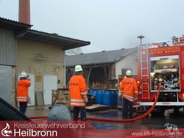 Das ersteintreffende Fahrzeug ist der Kommandowagen aus Neudenau. Kommandant Wagner übernimmt vor Ort die Einsatzleitung und erkundet die Lage schon bevor das nächste Fahrzeug, das Tragkraftspritzenfahrzeug aus Siglingen, eintrifft. Schnell gibt er an den Gruppenführer des Fahrzeugs die Befehle. Asserentnahme aus der Jagst und Aufbau der ersten Schlauchleitung zur Halle hin.