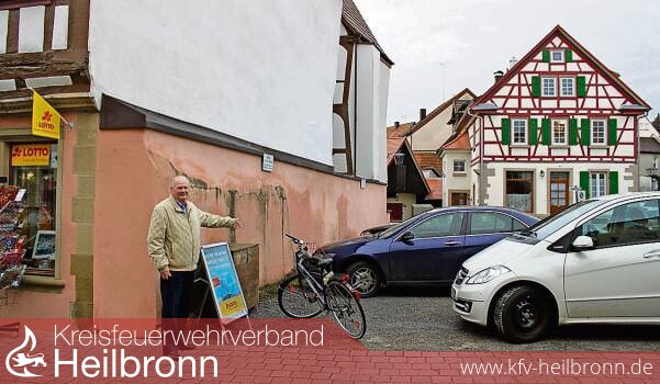 Bild 2: Der damalige Kommandant der Bad Wimpfener Wehr, Reinhold Korb, zeigt heute die Stelle an der Ecke Schul- und Hauptstraße, wo das Hotel stand. (Foto: Sara Furtwängler)