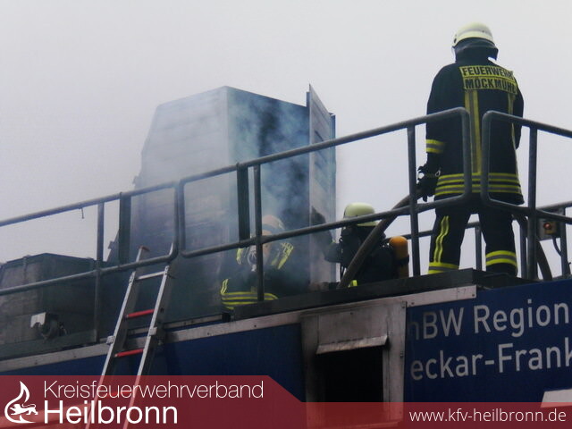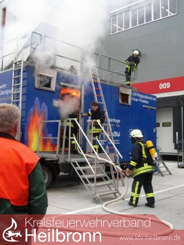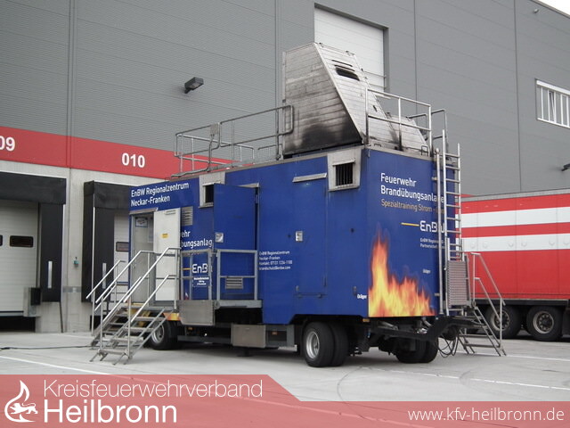 Aber auch die Simulation eines "flash-over" (dt. Durchzündung; bezeichnet den schlagartigen Übergang eines Schadenfeuers von der Entstehungsphase bis hin zur Vollbrandphase) ist in dieser Anlage möglich. Temperaturen zwischen 300 - 600°C, lagespezifischer Geräuschkulisse, schwierige und unterschiedliche Sichtbedingungen, herrschen bei realen Bedingungen vor. So können sich Feuerwehrleute mit Hitze, Dunkelheit, Enge und den Gefahren beim Atemschutzeinsatz vertraut machen. Die Bedienung und Überwachung der Anlage vor Ort übernahmen zuvor speziell eingewiesene Mitglieder der Feuerwehr Möckmühl. Bedienpersonal von EnBW ist in die Einweisung, den Aufbau und die Inbetriebnahme der Brandübungsanlage eingebunden und steht jederzeit, vor Ort bzw. telefonisch, zur Verfügung. Die Übung auf dem Gelände des VZ Möckmühl wurde durch alle Beteiligten als Erfolg bewertet und leistet einen weiteren Beitrag im Bereich der Ausbildung und Sicherheit der Atemschutzträger, was auch der Bevölkerung im Ernstfall zugute kommt. Ein herzliches Dankeschön an Herrn Axel Zielonka von Kaufland VZ, welcher die Logistik, den Ablauf sowie die Verpflegung mustergültig organisierte und plante.
