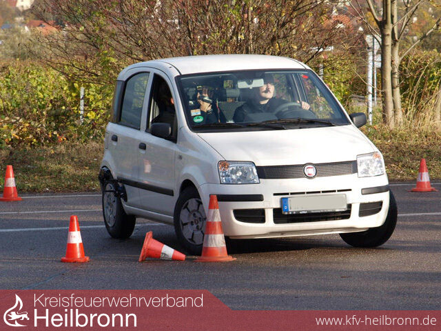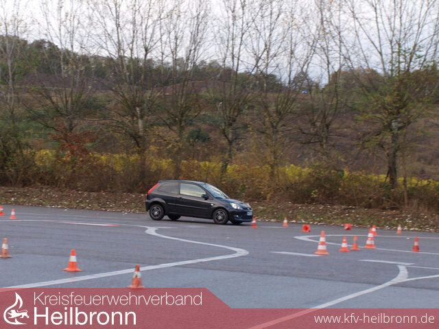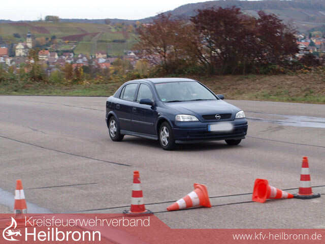 Zu elft stehen nun wir mit unseren Autos mitten auf dem Übungsgelände. „Bremsen“ lautet die erste Lektion, „Vollbremsen“. Jeder bekommt noch ein Funkgerät in die Hand gedrückt. „Funkdisziplin einhalten, und das heisst hier nur zuhören!“, gibt der Ausbilder uns mit auf den Weg, „das muss ich euch als Feuerwehrleute sagen, da Ihr mit solchen Dingern normalerweise anders umgeht.“ Also gut. Es geht los. Auf 60km/h beschleunigen und an den aufgestellten Pylonen voll in die Eisen treten. Mein Auto steht. „Gut gemacht, der Opel flackert schön mit den Bremslichtern“ höre ich über Funk. Der Ausbilder meint damit die Vollbremswarnung an die nachfolgenden Verkehrsteilnehmer, welche mein knapp zwei Jahre alter Astra hat. Schön zu wissen, das es funktioniert. Das ganze wird noch ein paar mal wiederholt. Auch mit 80 Sachen, ganz schöne Bremswegverlängerung. Zweite Bremslektion: Vollbremsen und dank ABS ausweichen eines Hindernisses unter Ausnutzung einer Abbiegespur. „Denkt daran nach dem links ausweichen auch wieder rechts zu lenken, sonnst landet Ihr entweder im Gegenverkehr oder im Graben. Das sieht dann so aus, wie Ihr es von den Unfällen kennt“. Am Ende bekommt jedoch jeder sein Fahrzeug in der gewünschten Bahn zum Stehen.