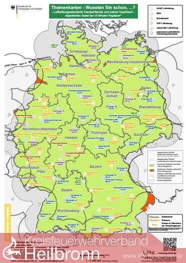 einer Arbeit im März dieses Jahres die Themenkarte zu Luftrettungsstandorten Deutschlands und seiner Nachbarn erstellt. Aus unterschiedlichen Datenbasen und Internetseiten wurde das Material zusammengetragen beziehungsweise abgeleitet, aus dem diese Karte entstand. Die aktuelle Themenkarte zeigt die durch die Luftrettung abgedeckten Gebiete bei 15 Minuten Flugdauer und die Organisationen, die an der Luftrettung beteiligt sind. Unter Beachtung der Quellenangabe darf die Karte kostenlos genutzt werden. Bei der Einbindung der Karte auf eine Internetseite sind ein paar Vorschriften zu beachten.