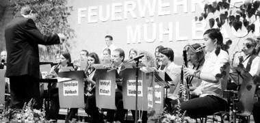 Helmut Seefried sorgte im Anschluss für das gekonnte Zusammenspiel der Feuerwehrkapelle. Die Jazz Suite Nr. 2 von Dimitri Shostakovic, bestehend aus Marsch, Walzer und Tanz, setzte den Gegensatz zu Let me weep aus Händels Oper Rinaldo. Ein wiederum untypisches Werk für Blasmusik folgte mit Funk attack. Einfach, innovativ, modern - Blasmusik, die allen Spaß macht. Der bunte Mix wurde nach der Pause mit der Entführung aus dem Serail fortgesetzt. Nach dem Stück von Mozart knüpfte die Feuerwehrkapelle mit Saxo Phoning an, und bewies mit dem Solo für fünf Saxophone aus der Bigband ra durchaus Showbandcharakter. Mit den Sambarythmen von Copacabana sorgen die Mühlbacher Musiker für gute Laune. Zum Ende des Frühlingskonzertes sollte aber dann doch die volkstümliche Blasmusik anklingen. In Erinnerung an Hubert Wolf, den Leiter der Böhmerwälder Musikanten, erklang ein Potpourri beliebter Melodien. Schon traditionell gebührte auch in diesem Jahr das Abschlusslied dem unvergessenen Ernst Mosch. Susanne Müller und Rolf Daubenthaler sangen Sterne der Heimat - das Publikum klatschte stimmungsvoll mit.
