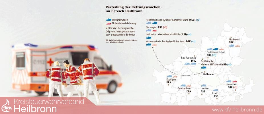 Deshalb hat der Bereichsausschuss, zusammengesetzt aus Vertretern von Rettungsdiensten und Krankenkassen, die Strukturen von externen Gutachtern überprüfen lassen und im Sommer 2015 mit einer Überarbeitung begonnen. Zwei neue Rettungswachen in Horkheim und Bad Wimpfen sind seitdem entstanden. Fünf neue beziehungsweise umgewidmete RTW und zwei weitere Notarztwagen sind im Einsatz, die teilweise rund um die Uhr, teilweise im Tagdienst abrufbar sind. 30 zusätzliche Rettungskräfte waren vorgesehen, 31 sind nach Auskunft von Rettungsdienstleiter Markus Stahl eingestellt worden. Außer den Hilfsdiensten Deutsches Rotes Kreuz (DRK) und Arbeiter-Samariter-Bund (ASB) sind nun auch die Johanniter-Unfallhilfe (JUH) und der Malteser Hilfsdienst (MHD) in die Strukturen eingebunden. Weitere Details sind der Karte zu entnehmen. Kostenpunkt für die gesamte Umstrukturierung: bis zu zwei Millionen Euro pro Jahr. Im zweiten Halbjahr 2016 sollen die neu geschaffenen Strukturen überprüft und bei Bedarf weitere Veränderungen vorgenommen werden, sagt DRK-Geschäftsführer Ludwig Landzettel. „Momentan gehen wir mit großer Wahrscheinlichkeit davon aus, dass wir das 2016 in den Griff bekommen werden.“