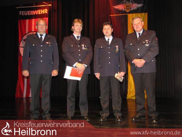 Zusammen mit Kommandant Schuster konnte er die beiden Feuerwehrkameraden Bernd Ehrhardt, stv. Kommandant der Oedheimer Wehr seit 2000 und von 1989 2000 Kassier der Wehr, sowie Günter Traub, ein Mann, der immer da ist, wenn man ihn braucht für 25 Jahre aktive Dienstzeit mit dem Feuerwehr-Ehrenzeichen in Silber auszeichnen. Beide waren 1985 in die Wehr eingetreten. Rolf Weiss konnte für 50 Jahre Mitgliedschaft und Dieter Müller für 40 Jahre Mitgliedschaft in der Wehr ausgezeichnet werden. Beide führen seit einigen Jahren die Altersabteilung und sind unverzichtbar für die Kameradschaft bei unseren Senioren. Für stolze 60 Jahre Mitgliedschaft konnte Willi Vogt und für 50 Jahre Heinz Keicher ebenfalls mit einer Urkunde und einem Präsent ausgezeichnet werden.