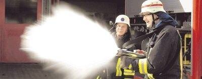 Bild: Kommandant Andreas Schick (rechts) und sein Stellvertreter Wolfgang Fischer demonstrieren den Einsatz eines Hochdrucklöschers. (Foto: Ulrike Kugler)