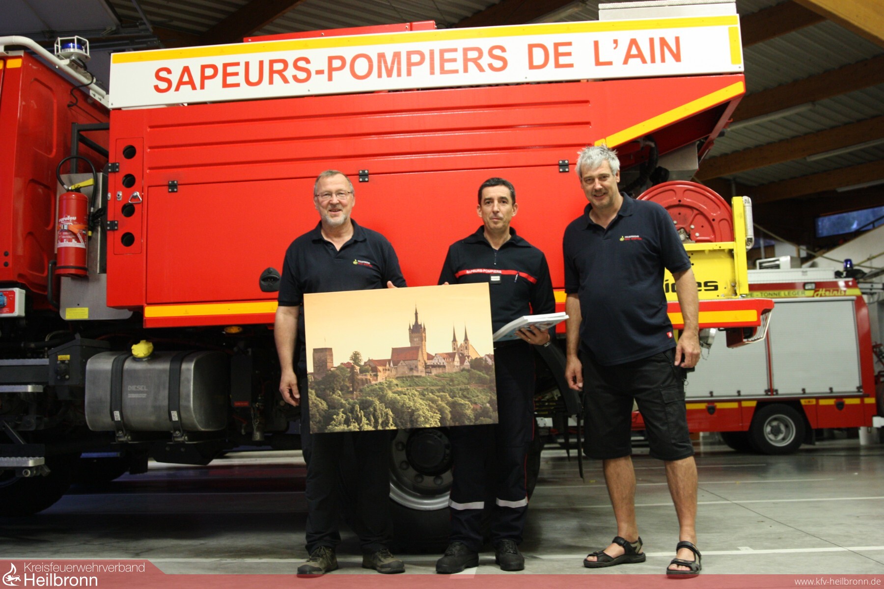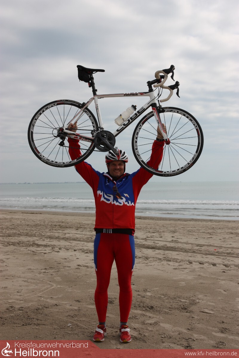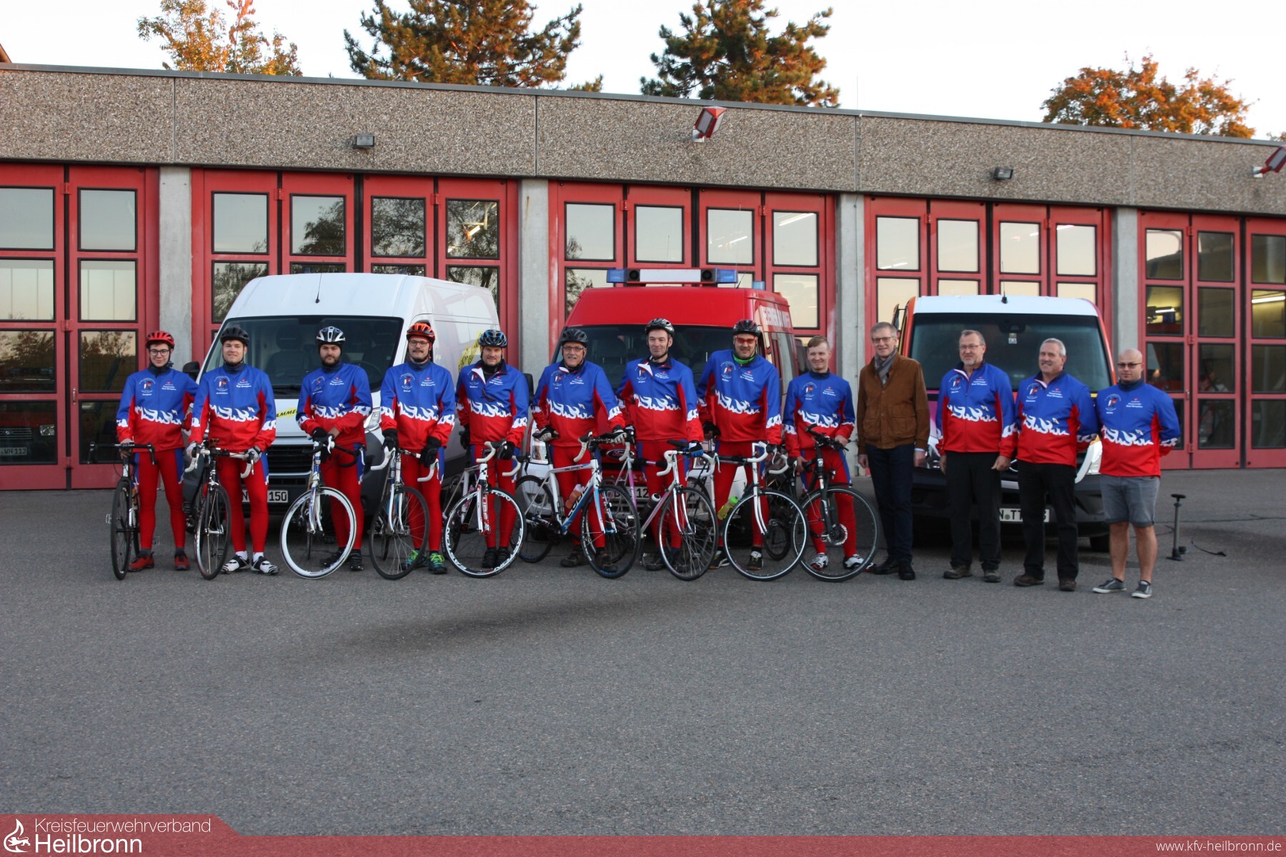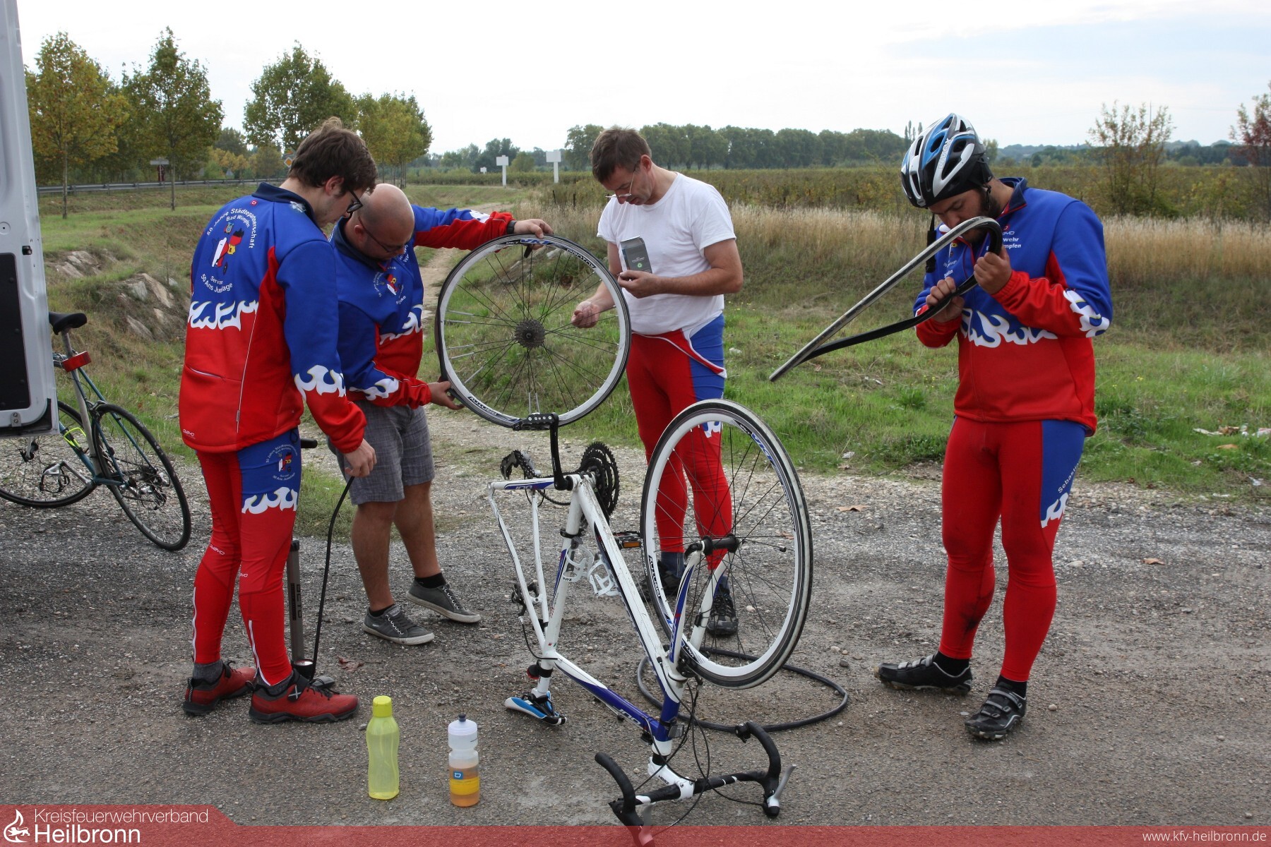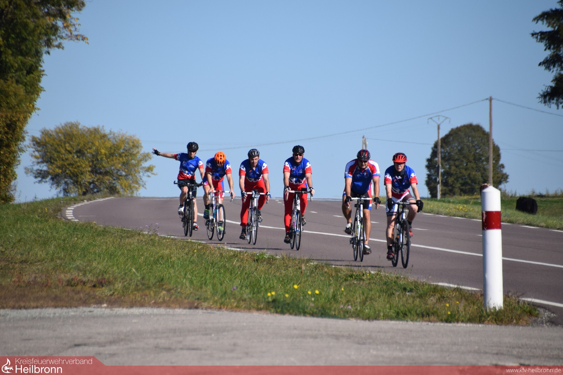 Um die ca. 1000 Km in nur 5 Tagen zu bewältigen, teilten sich 9 Radler in 3 Teams auf. So ergab sich folgender Ablauf: Es fuhren immer 6 Kameraden auf ihren Rennrädern, nach ca. 25 Km an einem festgelegtem Wechselpunkt wurden 3 Radler ausgetauscht. So fuhr jeder Fahrradfahrer 50 Km am Stück und hatte dann ca. 25 Km Pause. Die 3 Radler fuhren dann in einem Begleitfahrzeug zum nächsten Wechselpunkt. Hierbei konnten sie sich etwas erholen, essen und trinken. Dieser Ablauf wiederholte sich solange bist das Tagesziel von ca. 200Km erreicht war. Dann war es soweit. An einem Samstagmorgen im Oktober 2018 verabschiedete Bürgermeister Claus Brechter und einige Feuerwehrkameraden die 9 Radfahrer sowie deren 3 Begleiter und der Tross machte sich unter dem Motto „Auf nach Servian, im Zeichen der Freundschaft“ auf den Weg. 1xSturz, 2x 8ter im Hinterrad, 2x Wespenstiche, 2x Plattfüße und ein Totalschaden eines Rennrades (Bruch des Kettenspanners der Schaltung) sind die Schlagwörter dieser Tour. Natürlich hatte der Tross noch mit anderen Hindernissen: wie Ausfall der Navigation, Umwege mussten gefahren werden (wegen Straßensperrungen) enorme Anstiege oder auch durch hohes Verkehrsaufkommen zu bewältigen. Mit Sicherheit wird sich auch jeder der Teilnehmer, an die Gastfreundschaft der französischen Feuerwehrkammeraden auf der gesamten Tour erinnern. Wir übernachteten in Marckolsheim, Besancon, Meximieux und Doncere, und wurden immer herzlich begrüßt, zum Essen eingeladen oder es wurde für uns gekocht. Fachgespräche führte man teils auf Englisch, oder mit Händen und Füßen. Kurz gesagt: Es wurde der Internationale Feuerwehraustausch auch schon auf der Tour gepflegt und gelebt, bevor die Radtour „im Zeichen der Freundschaft“ nach 5 Tagen und 1000 Km auf dem Hof des Feuerwehrgerätehaus in Servian endetet.