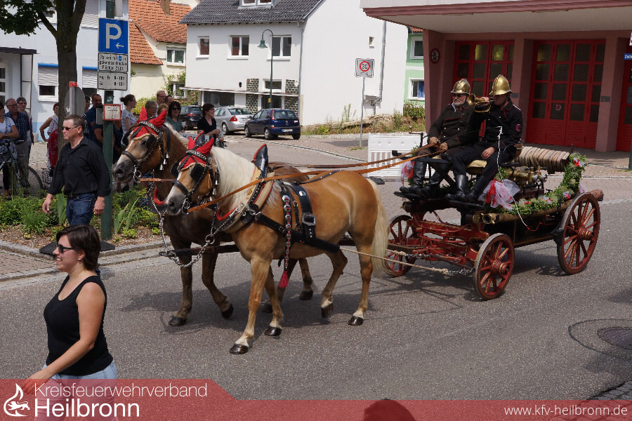 Dann startete der erste große Umzug seit 25 Jahren mit über 50 Gruppen von der Degmarner über die Brunnenstraße, die Neuenstädter und die Hauptstraße bis zum Festplatz im Säukies. Vorneweg unser pferdegezogenes Hydrophor, der 1880 der Oedheimer Feuerwehr übergeben wurde und somit über 136 Jahre alt ist. Auf dem Kutschbock Manfred Schiemer und Gerhard Schmierer, der Trompeter, in historischen Uniformen. Mit stolzgeschwelter Brust folgte die Oedheimer Jubiläumswehr, angeführt von Kommandant Sven Kübler, Bürgermeister Matthias Schmitt und Ehrenkommandant Franz Schuster. Die Choreographie des Umzugs ließ die Spitze des Umzugs von ganz am Ende starten, so dass auch alle Teilnehmer den Umzug erleben konnten.