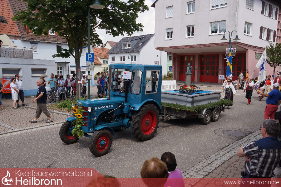 Die Rathaus- und Bauhofmitarbeiter konnten stolz das lange verschollen geglaubte und nun wieder strahlende Rathaus mit dem Seitenanbau präsentieren. Unsere Kameraden vom Historische Feuerwehrfahrzeuge Neuenstadt e.V. nahmen mit sieben tollen Fahrzeugen am Umzug teil, an der Spitze ein VW-Käfer, zwei historischen, bulligen Drehleitern aus den 60igern und mehreren, ebenso kräftigen Magirus-Löschfahrzeugen.