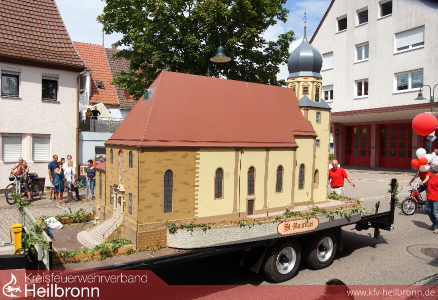 Die Mitglieder des Gewerbevereins Oedheim haben die Kirche unter der Leitung von Gerhard Hackel aufgebaut und beim Umzug besonders tatkräftig und beschwingt begleitet. Das Fahrzeug des Meravo-Flughafens mit Fahrer Bernd Hauber und ein TL 16 des Jahrgangs 1958 aus Bad Friedrichshall trieben den Gewerbeverein an. .