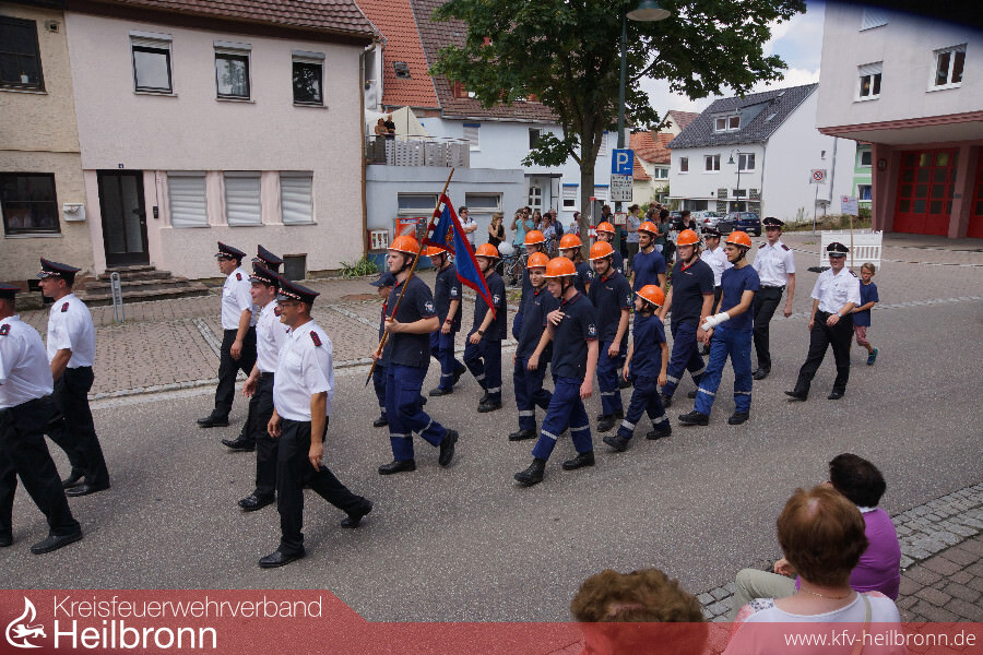 Theater-Spielen auf einem Festwagen geht doch nicht. Dass es doch geht, bewies die Theatergruppe der Oedheimer Kolpingsfamilie, die ein Theaterstück mit vier Schauspielern beim Festzug aufführte, ebenfalls ein Augenschmaus. Auch die Kinder vom Neuberg-Kindergarten mit ihren Betreuerinnen ließen es sich nicht nehmen, der Oedheimer Feuerwehr durch die Teilnahme am Festumzug herzlich zu gratulieren und dafür Sorge zu tragen, dass alle Altersklassen am Umzug beteiligt waren. Besonders schön war auch, dass die Fahnenschwinger den Spielmannszug aus Ilsfeld begleiteten und mit ihren durch die Luft fliegenden Fahnen für tolle Stimmung sorgten. Die befreundeten Feuerwehrkameraden aus Wettenberg-Launsbach in Nordhessen beschlossen einen hervorragend organisierten und für große Stimmung sorgenden Festumzug.