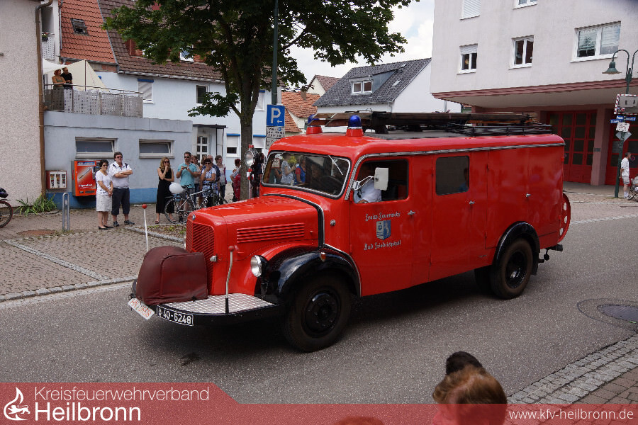 Nach der Jugendfeuerwehr mit ihren Betreuern folgten unsere aktuellen Fahrzeuge, vom ELW über den SW 1.000, den MTW, das LF 8 mit Hochwasser-Anhänger, das HLF mit dem Schlauchboot und das TLF und stellten somit die inzwischen beachtliche Ausstattung der Oedheimer Feuerwehr vor. Unsere Altersabteilung konnte die beiden Alt-Bürgermeister Manfred Ley und Ulrich Ruoff in ihren Reihen aufnehmen und wurde vom ersten Oedheimer Feuerwehrfahrzeug, dem LF 8 von 1961 begleitet. Dem historischen Bachert-Fahrzeug sieht man seine inzwischen 55 Jahre nicht an. Der Spielmannszug Bad Friedrichshall wurde begleitet von den Kameraden aus Friedrichshall in historischen Uniformen.