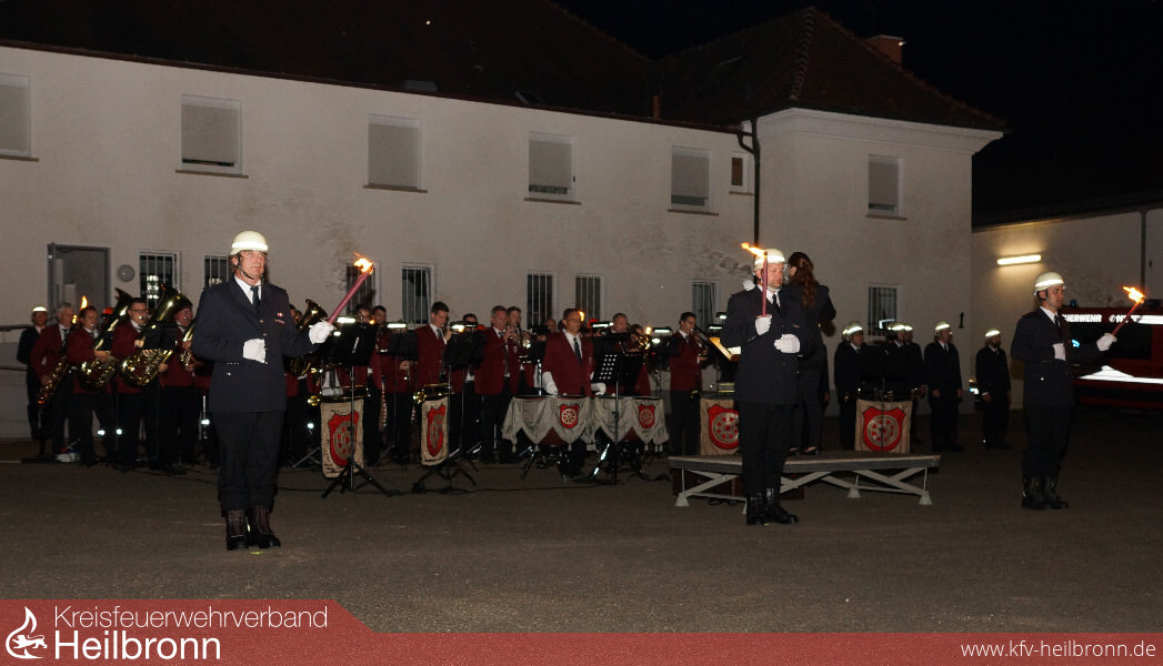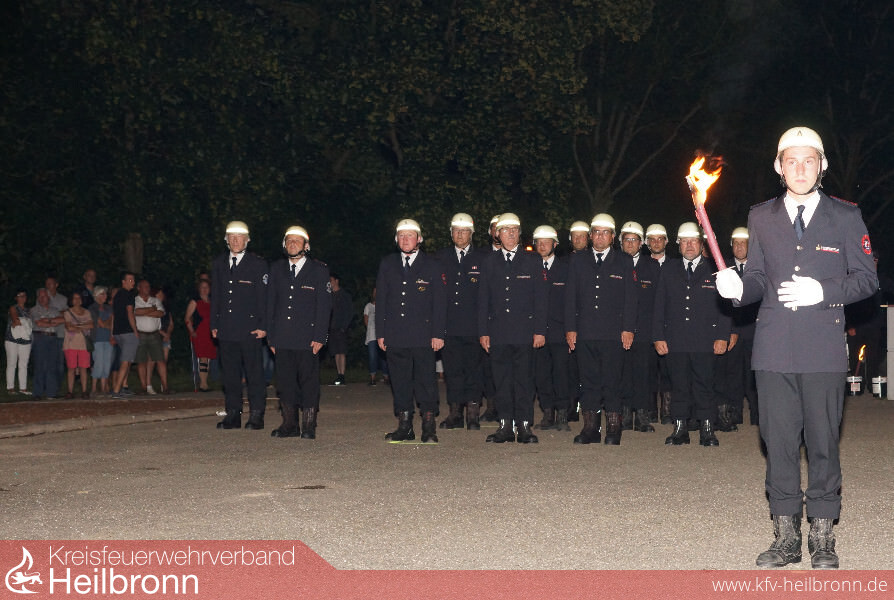 Der Große Zapfenstreich Dann aber wurden hinter dem Kath. Gemeindehaus die letzten Vorbereitungen für den letzten Höhepunkt getroffen. Als es dunkel wurde, startete ein nochmals sehr emotionaler Glanzpunkt unseres Jubiläums. Der Große Zapfenstreich, der nur bei hohen öffentlichen Anlässen gezeigt werden kann, sorgte nochmals für Gänsehaut-Atmosphäre. Unter der Leitung von Gerhard Kupfer aus Bad Friedrichshall marschierten die Oedheimer Feuerwehrleute bei den Klängen des Spielmannszugs Bad Friedrichshall und dem Musikverein Neudenau bei Fackelschein auf den Festplatz. Die Serenade und weitere musikalische High-Lights sowie die deutsche Nationalhymne bewegten nicht nur die vielen Zuschauer, sondern auch die beteiligten Feuerwehrkameraden und Musiker sehr. Als nach dem Auszug des Zapfenstreichs die Militärmusik verstummte, machten sich auch die vielen Besucher emotional tief bewegt und berührt auf den Heimweg.