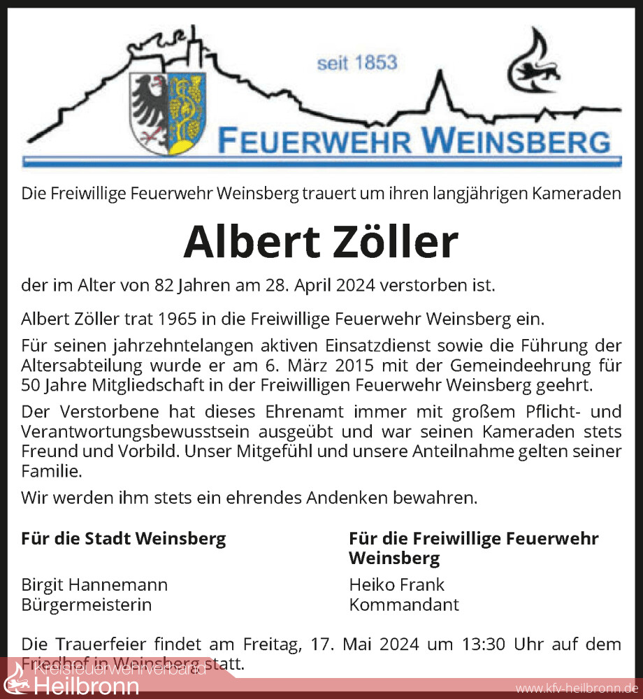 Die Freiwillige Feuerwehr Weinsberg trauert um ihren langjährigen Kameraden Albert Zöller der im Alter von 82 Jahren am 28. April 2024 verstorben ist.