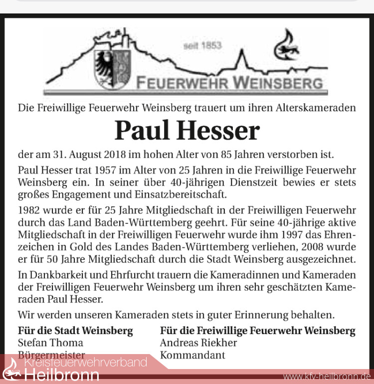 In Dankbarkeit und Ehrfurcht trauern die Kameradinnen und Kameraden der Freiwilligen Feuerwehr Weinsberg um ihren sehr geschätzten Kameraden Paul Hesser.
