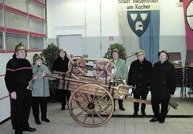 Abteilungskommandant Lothar Vogt hatte eine Überraschung: Sein Vater Egon Vogt, heute 76 Jahre alt, fuhr in den 40er Jahren auf dem Fahrrad mit der Alarmtute durch Stein, wenn es Alarm gab. Damals gab es eine Frauenlöschgruppe, weil nicht mehr viele Männer da waren. Fünf dieser Damen schoben am Festabend einen historischen Schlauchwagen unter begeistertem Beifall der Gäste in die Halle.