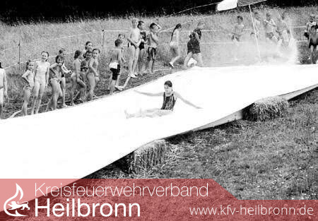 Wo die Kinder im Winter Schlittenfahren hat die Feuerwehr für die ältesten Kinder eine Wasserrutsche aufgebaut. Sie ist 32 Meter lang und, damit ja niemand neben 'naus rutscht, ganz schön breit. Und damit es richtig schön rutscht, werden die Kinder von Tilo vorher noch mit Schmierseife richtig eingeseift. Und dann geht es auf der mit einem Feuerwehrschlauch reichlich besprühten Plane hinunter und hinein in ein Wasserbecken. Alle sind sich einig: diese Rutsche ist viel besser als die im Freibad, Man muss sich nicht erst lange anstellen, jeder kommt sofort dran. Immer wieder und keiner kann genug bekommen. Und dass nichts passiert, darauf achtet Stephan Jäckle.