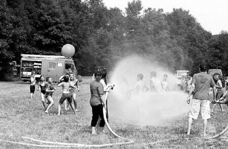 Vierundachtzig Kinder zwischen sieben und dreizehn sind gekommen und werden in drei Gruppen eingeteilt. Die jüngsten machen unter der Regie von Annerose Frank Spiele wie Kistenlaufen. Dabei kommt auch eine Kübelspritze, das kleinste feuerwehrtechnische Gerät, wie Kommandant Günter Vogel versichert, zum Einsatz: der eine muss kräftig pumpen und der andere darf spritzen. Bald sind alle pitschnass, was aber bei dem warmen Wetter so gar nichts ausmacht.