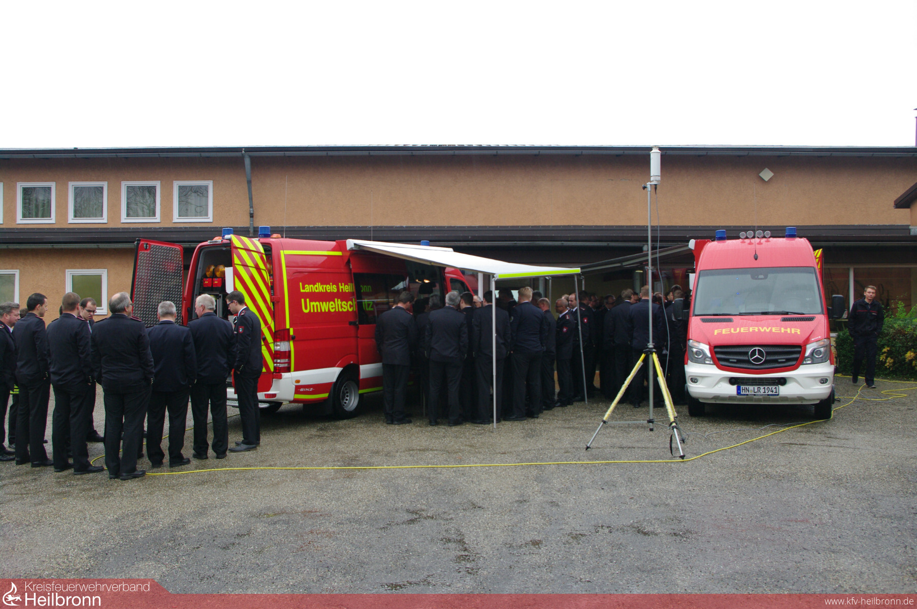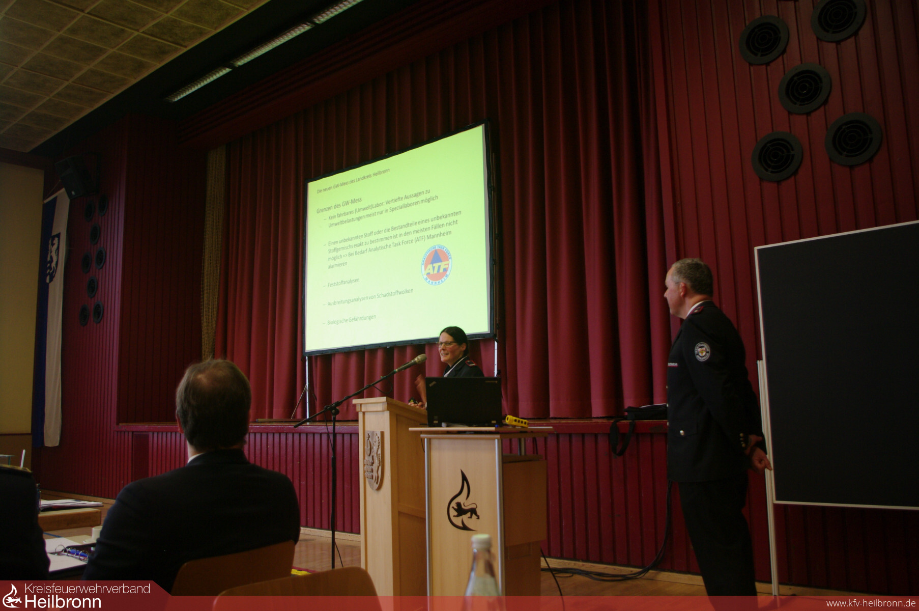 Im ersten Tagesordnungspunkt stelle Uwe Vogel das Gefahrstoffkonzept im Landkreis Heilbronn sowie die beiden neu beschafften Gerätewagen Messtechnik vor. Dieses Konzept baut auf die speziell ausgestatteten Gefahrstoffeinheiten die in Bad Rappenau (Gefahrstoffzug), Lauffen a.N. (Messeinheit), Neckarsulm (Messeinheit) und Weinsberg (Gefahrstoff- und Dekonzug) stationiert sind. Mit diesen Einheiten wird der gesamte Landkreis abgedeckt. Dabei fährt immer die Einheit mit der kürzesten Fahrzeit die jeweilige Einsatzstelle an. Die fachliche Beratung bei Gefahrstoffeinsätzen erfolgt durch die drei Fachberater Chemie, Aßfalg (Feuerwehr Schwaigern), Hilbert (Feuerwehr Bad Friedrichshall) und Dr. Sendelbach (Feuerwehr Neckarsulm).