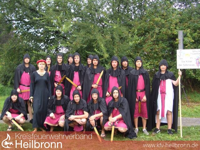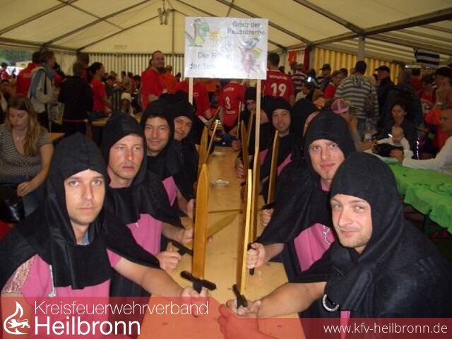 Dafür waren sie bei der Performance unschlagbar. Zum 2. Mal in Folge belegten sie unter „Grisu, der Feuerdrache“ als „Die Ritter der Tafelrunde“ den wohlverdienten 1. Platz. Unter großem Beifall des voll besetzten Festzeltes nahmen Dennis Weissert als Team-Chef und Alina Sailer den Preis: einen Gutschein über ein Spanferkel, entgegen. Mit ihrer mittelalterlichen Bekleidung mit den schwarzen Umhängen und Hauben, welche von Corinna Mayer und Ilonka Plötz-Sailer genäht wurden, incl. den dazu gehörenden Schwertern und natürlich einem Burgfräulein zogen sie die Blicke auf sich.