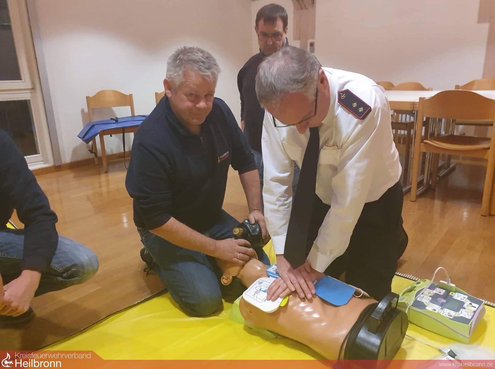 Am 23.11.219 war Andreas Giel und sein Team bei der Feuerwehr Obersulm Abt. Sülzbach. Erklärt wurde die richtige Anwendung eines Defi und sachgerechte Herz-Lungen Wiederbelebung. In Obersulm hängen in jeder Volksbankfiliale, am Breitenauer See am Kiosk 1, im Freibad oder auch im Sportheim Sülzbach Defibrillatoren. Bei den praktischen Übungen musste an den Dummy’s selbst Hand angelegt werden. Herzdruckmassage und Beatmung erfordern zwar etwas Übung, sind aber auch von Laien leicht zu erlernen. Die richtige Lagerung von bewusstlosen Personen und das stoppen starker Blutungen ergänzten den interessanten Übungsnachmittag. Unser Dank gilt den engagierten Kameradinnen und Kameraden des DRK Obersulm.