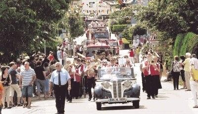 Bild: Der große Festumzug zieht durch die Kelteräckerstraße. Im alten BMW-Cabrio von 1938 fährt Bürgermeister Joachim Weller (links) voraus. (Foto: Simone Möndel)