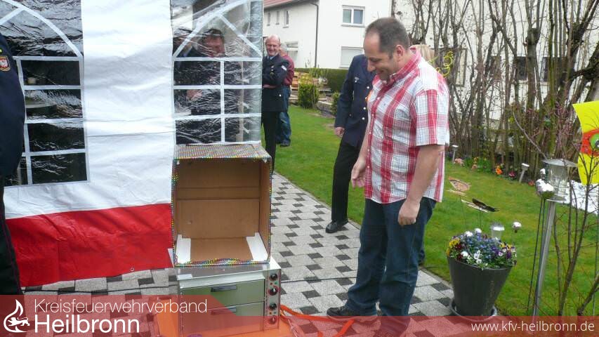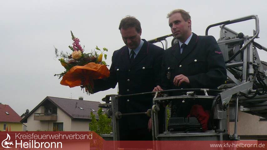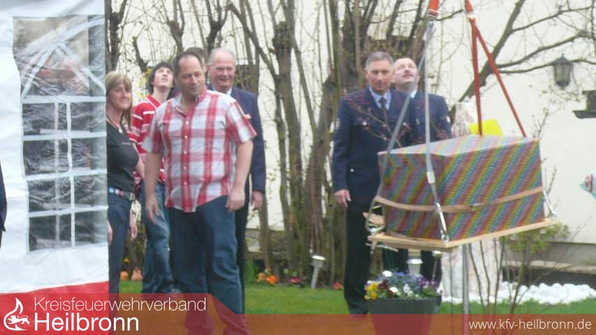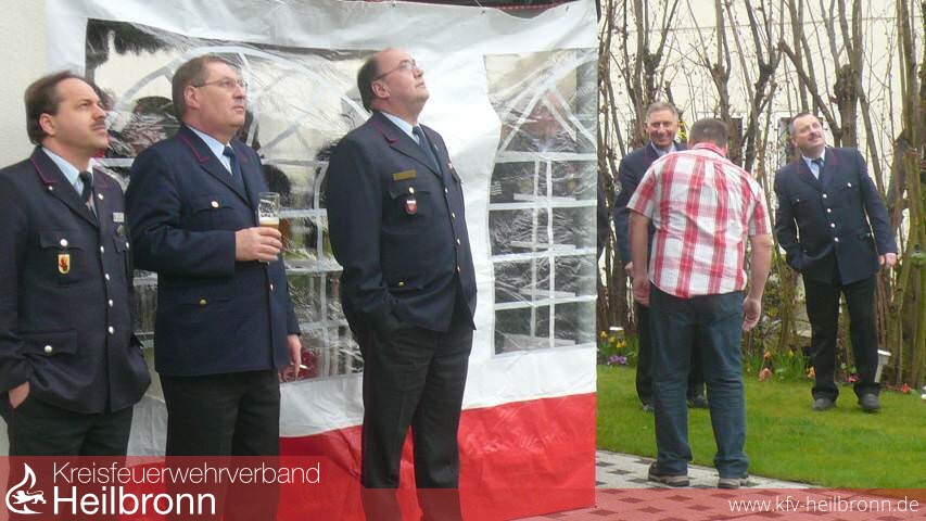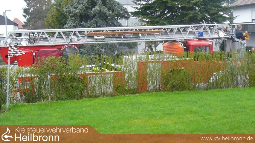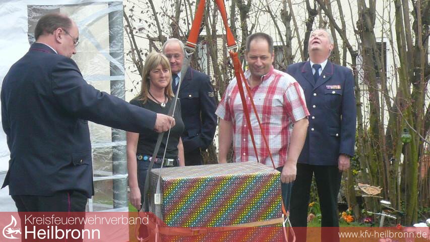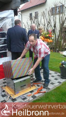 Dabei darf es jetzt auch heiß werden - am besten im neuen Pizzaofen, den der Vorsitzende des Kreisfeuerwehrverbandes Heilbronn, Reinhold Korb stilgerecht überreichte. Die Neckarsulmer Kameraden hievten das Geschenk und einen Blumenstrauß für die Ehegattin Petra mit der Drehleiter über den Gartenzaun.