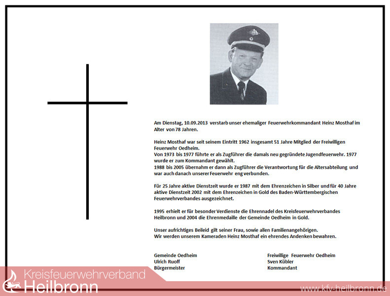 Am Dienstag, 10.09.2013 verstarb unser ehemaliger Feuerwehrkommandant Heinz Mosthaf im Alter von 78 Jahren.