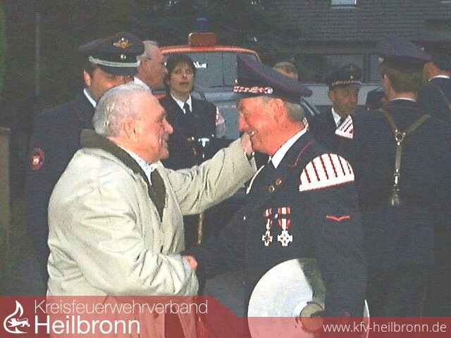 "Glaubst dua, die kommed ieberhabt??" so stand Ehrenmitglied Helmut Apelt am 17.April 2002 gegen 19:40 Uhr am Fenster und wartete, ob sich wenigstens der Kommandant bei sich blicken lassen würde. Immerhin war Helmut Apelt 45 Jahre Gerätewart bei der Wehr in Brackenheim. Doch angekündigt hatte sich niemand. Oder kommt doch vielleicht eine Abordnung mit der Drehleiter vorbei und macht ihm zu seinem 80.ten Wiegenfeste eine kleine Aufwartung?