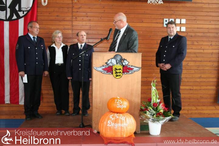 Bei der Freiwilligen Feuerwehr Oedheim, Abteilung Degmarn, konnte beim Jubiläum nicht nur das Bestehen der Feuerwehr in Degmarn seit 125 Jahren und der Zusammenschluss der beiden Wehren Oedheim und Degmarn im Rahmen der Kommunalreform vor 40 Jahren gefeiert werden. Ebenfalls Grund zur Freude war, dass Eugen Bertsch im Rahmen des offiziellen Teils für 40 Jahre aktive Dienstzeit mit dem Feuerwehr-Ehrenzeichen in Gold des Landes Baden-Württemberg ausgezeichnet werden konnte.