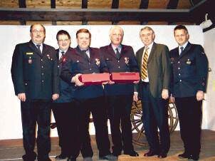 Für 25-jährige aktive Mitgliedschaft in der Feuerwehr Obersulm wurden im Rahmen der Jahreshauptversammlung Martin Kolb, Rolf Kühner, Jürgen Küstner und Johannes Kübler geehrt. Kommandant Reiner Frisch betonte, welch lange Zeitspanne dieses Vierteljahrhundert in unserer schnelllebigen Zeit bedeutet. (Von links) Kreisbrandmeister Uwe Vogel, Kommandant Reiner Frisch, Jürgen Küstner, Johannes Kübler, Bürgermeister Harry Murso und der stellvertretende Kommandant Michael Schepperle. (Foto: Karin Freudenberger)