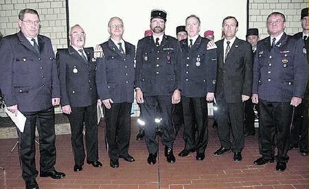Foto: Ehrende und Geehrte bei der Feuerwehr Bad Friedrichshall (von links): Hermann Jochim, Ulrich Kortt, Reiner Baumgart, Dominique Giraudon, Gerhard Kupfer, Peter Dolderer, Kurt Semen. (Foto: Edgar Herterich)