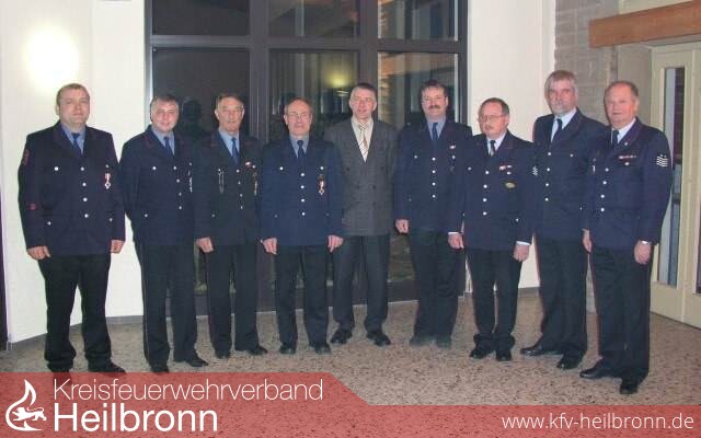 Auf dem Bild v.l.n.r.: Hermann Schilling (Grombach), Hartmut Eszterle (Obergimpern), Günter Merkle (Bad Rappenau), Artur Kober (Fürfeld), Oberbürgermeister Hans-Heribert Blättgen, stv. Gesamtkommandant Bernd Guggolz, Stadtbrandmeister Wilhelm Bödinger, Kreisbrandmeister Hans-Wilhelm Hansmann und der Vorsitzende des Kreisfeuerwehrverbandes Heilbronn, Reinhold Korb. Auf dem Bild fehlen Bernd Blessinger und Helmut Weißer.