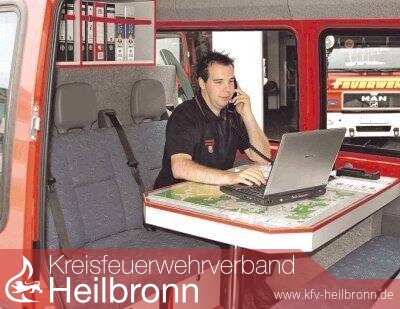 Bild: 2006 hat die Abteilung Wüstenrot einen neuen Einsatzleitwagen mit Funktelefon und Laptop erhalten. Die Führungsgruppe, zu der auch der stellvertretende Kommandant Andreas Reh gehört, zieht hier im Notfall die Fäden. (Foto: Archiv/Döttling)