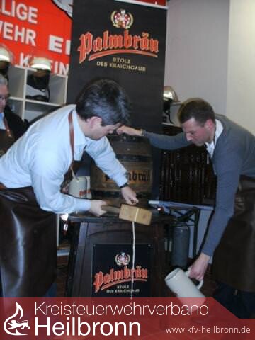 Bürgermeister Peter Thalmann überbrachte neben seinen Worten auch Grüße des Oberbürgermeisters und hatte letztlich die Ehre nach zwei weiteren kurzen Ansprachen das erste Fass Palmbräu anzustechen und zeigte eindrucksvoll warum er Baubürgermeister ist. Mit einem gekonnten Schlag brachte er das Gold zum fließen. Anschließend verteilten Ortsvorsteher Friedhelm Ebert, Palmbräubetriebsleiter Oliver Kohler, sowie das Kommando um Bernd Söhner und Lars Wind Freibier an die anwesenden Ehrengäste wie Stadt- und Ortschaftsräte, Palmbräuchef Scheidtweiler, einige Vereinsvorstände, geladene Alterskameraden sowie Gäste aus Nah und Fern. So warf die Eröffnung erneut einen schönen Glanz auf den Feuerwehrbesen und sorgte für einen geselligen Start in das Festwochenende.